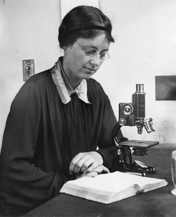 凱瑟琳·德魯-貝克和她的顯微鏡并肩而立。