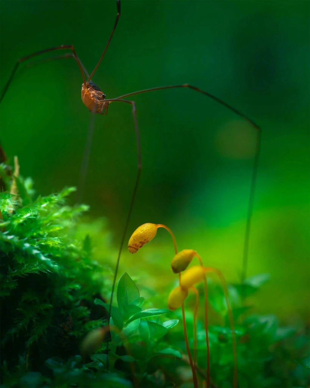 這組微距攝影作品展現(xiàn)了一個(gè)充滿生機(jī)與活力的世界。從聳立在植物上的長(zhǎng)腿蜘蛛,到精致地掛在蘑菇上的露珠,每張照片都是對(duì)大自然藝術(shù)的贊美。微距鏡頭下,靜謐的自然風(fēng)景卻蘊(yùn)藏著無窮的生機(jī)和生命的韻律。