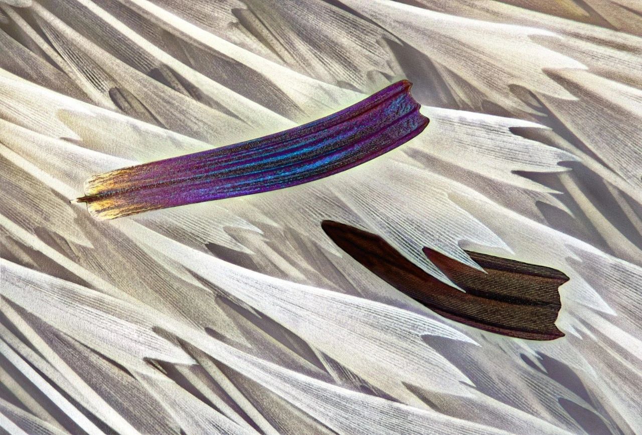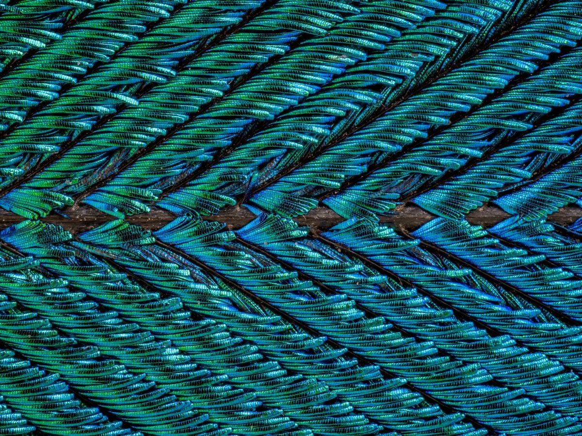 孔雀是華麗的鳥類,瑞典科學家兼攝影師H?kan Kvarnstr?m在這個4倍物鏡放大的單羽羽毛中捕捉到了它們炫目炫的展示背后的令人眼花繚亂的細節。