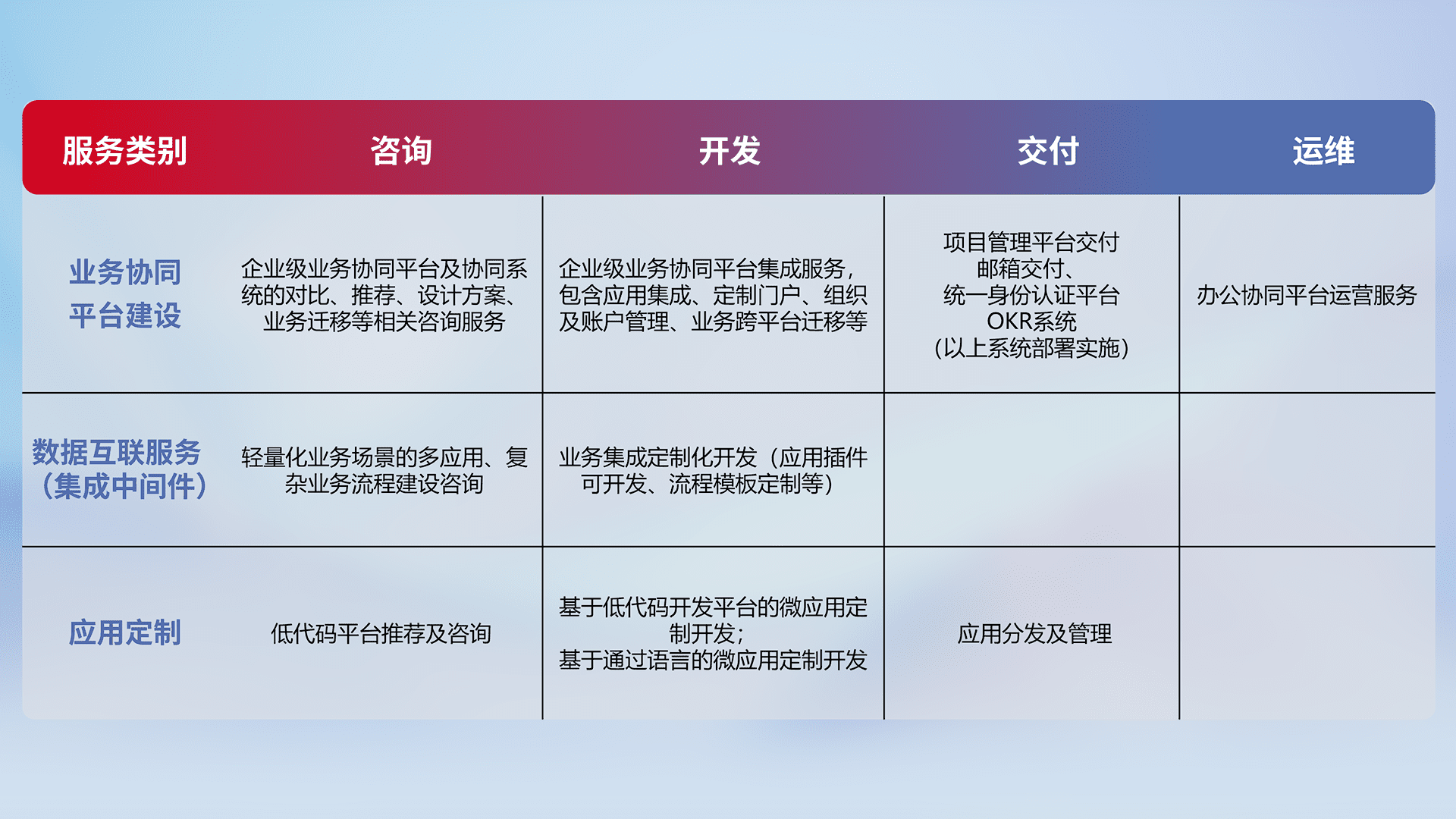 针对钉钉、、、企微、、IDaas等平台级产品提供产品的规划、、、、方案、、、、交付、、、、定制化开发等服务,,,实现如统一协同办公、、智能客户服务、、混合会议管理、、、智能数据查询、、、等业务场景,,,,实现数字化转型。。